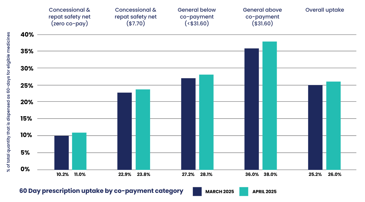 Official PBS data through to April 2025 shows that the uptake rate of 60-day prescriptions varies widely, in line with co-payment levels. This may be partly due to the different levels of savings that accrue to the patient from 60-day scripts but also may be a sign of the different levels of complexity in medicine regimens.