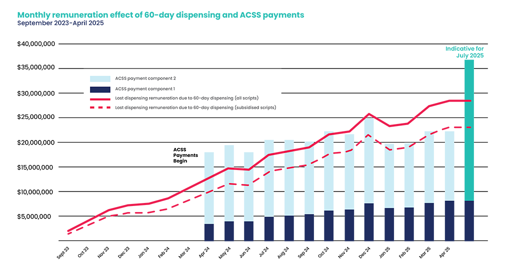 The chart below shows (in red) the month-by-month lost dispensing remuneration (dispensing fees and AHI fees) because of 60-day dispensing. The blue bars show the ACSS payments in comparison.