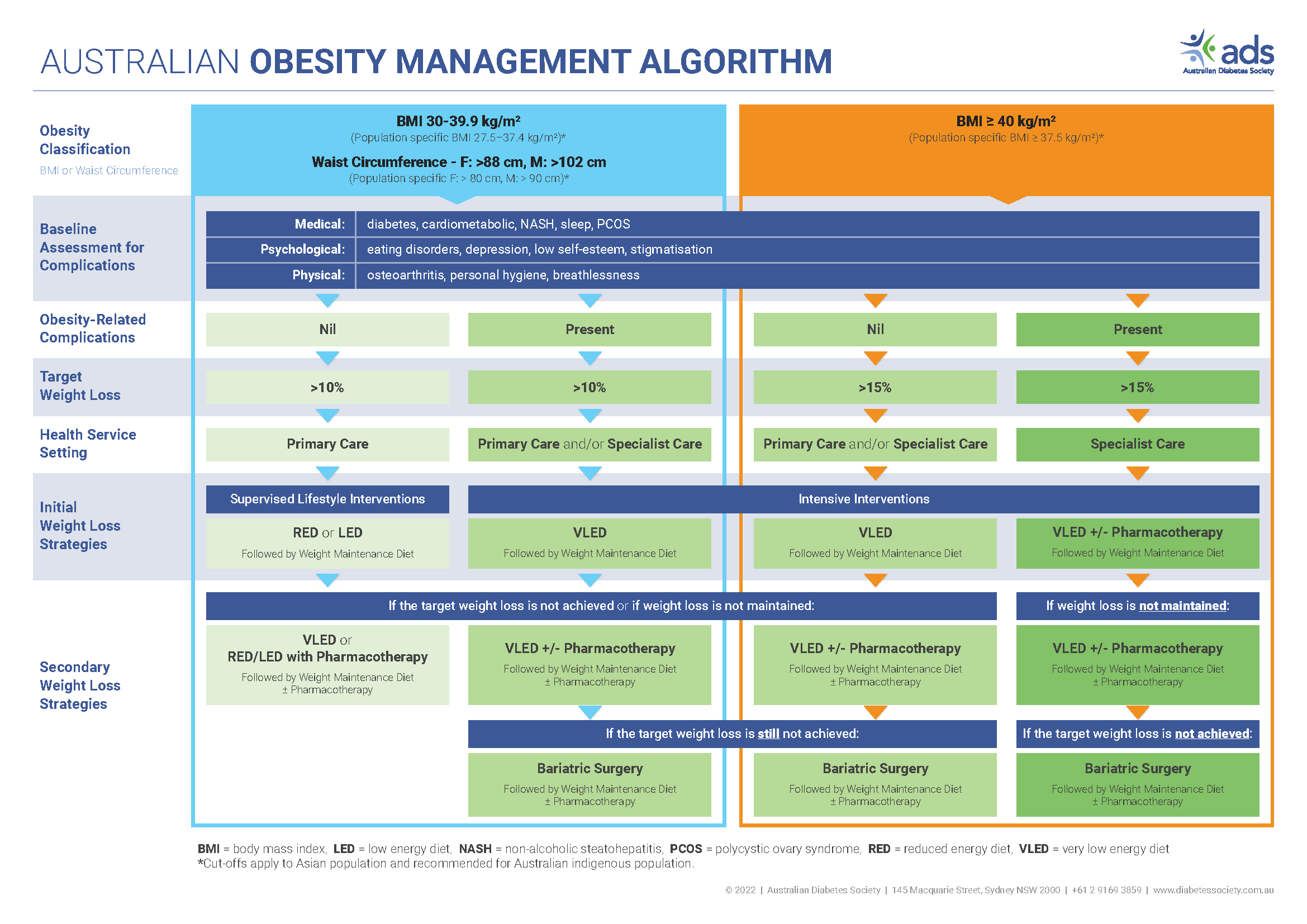 - Australian Diabetes Society. Australian Obesity Management Algorithm [Diagram] 2022 [Available from: https://www.diabetessociety.com.au/downloads/20220902 percent20Diagram percent20- percent20Australian percent20Obesity percent20Management percent20Algorithm percent202022 percent20.pdf.