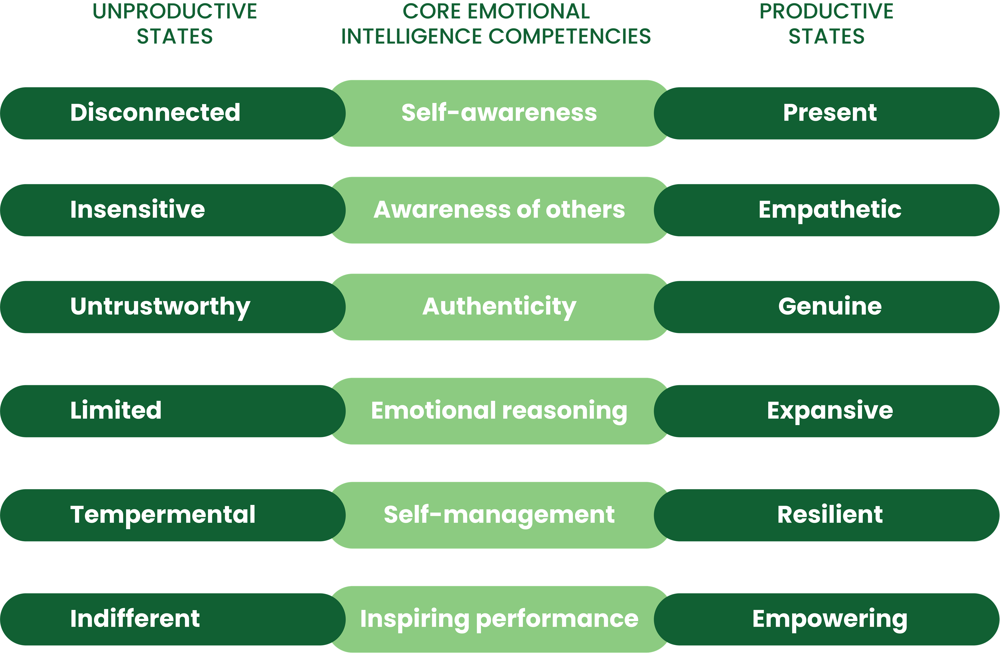 As shown in figure 1, if demonstrated more often, these competencies enable people to be the productive being states of present, empathetic, genuine, expansive, resilient and empowering. This is in direct contrast to if emotional intelligence core competencies are not demonstrated. When not demonstrated, people shift to be the unproductive being states, disconnected, insensitive, untrustworthy, limited, temperamental and indifferent 1.